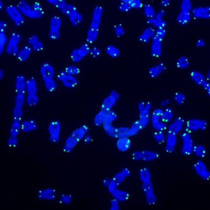 foto: Telomeri (verde) și ADN (albastru) în timpul reparării ADN-ului. Salk Institute