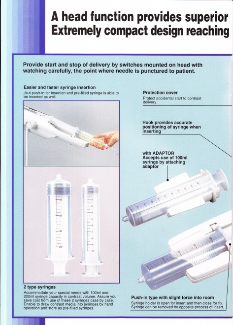 Seringi 50 ml, 100 ml,125 ml, 200ml, tuburi conectoare cu valva, tuburi conectoare cu 2 valve si camera de picurare, tuburi conectoare la pacient dedicate injectoarelor automate Nemoto.