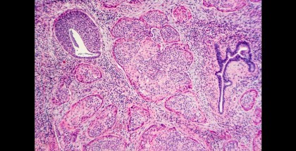 foto: Cancer de col uterin: carcinom scuamos invaziv care apare în asociere cu displazia scuamoasă severă legată de HPV (virusul papiloma uman). Vaccinarea HPV la adolescenți poate fi preventivă. Courtesy: David A. Litman
