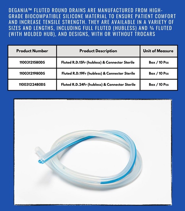 - Tubul de drenaj Fluted are 4 caneluri si un design special pentru a îmbunătăți contactul dintre țesut și dren și pentru a oferi mai multe canale de drenaj.