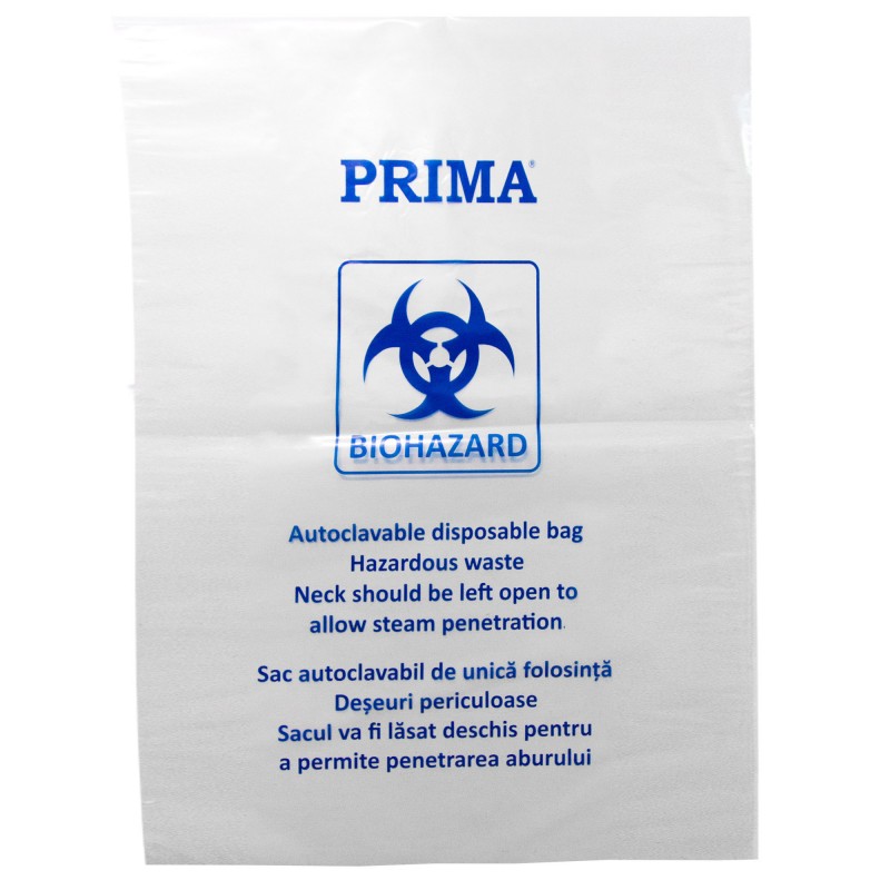 Saci autoclavabili, 10 bucati, transparenti, confectionati din polietilena. Acestia sunt de unica folosinta, rezistenti la 134˚C si sunt inscriptionati cu pictograma biohazard.