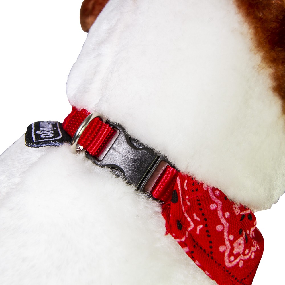 Bandana rosie pentru caini, din material textil si inchidere cu catarama plastic, lungime ajustabila: 40 - 65 cm.